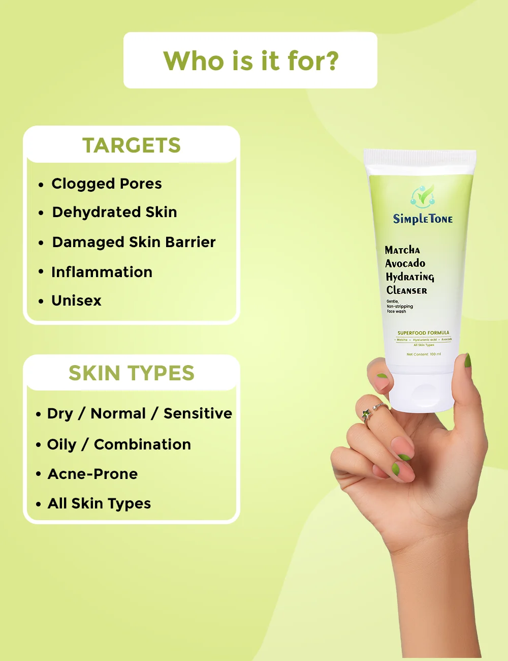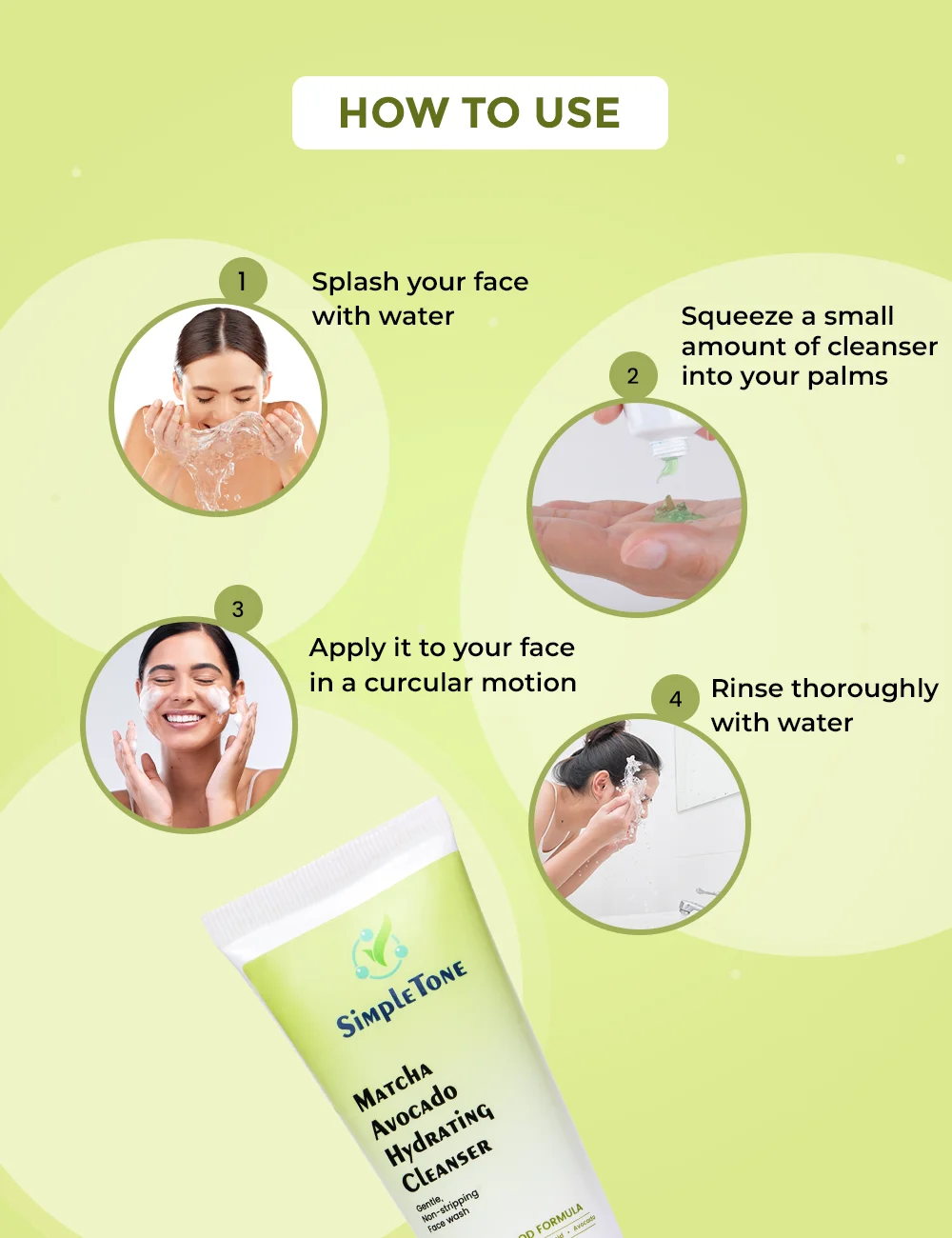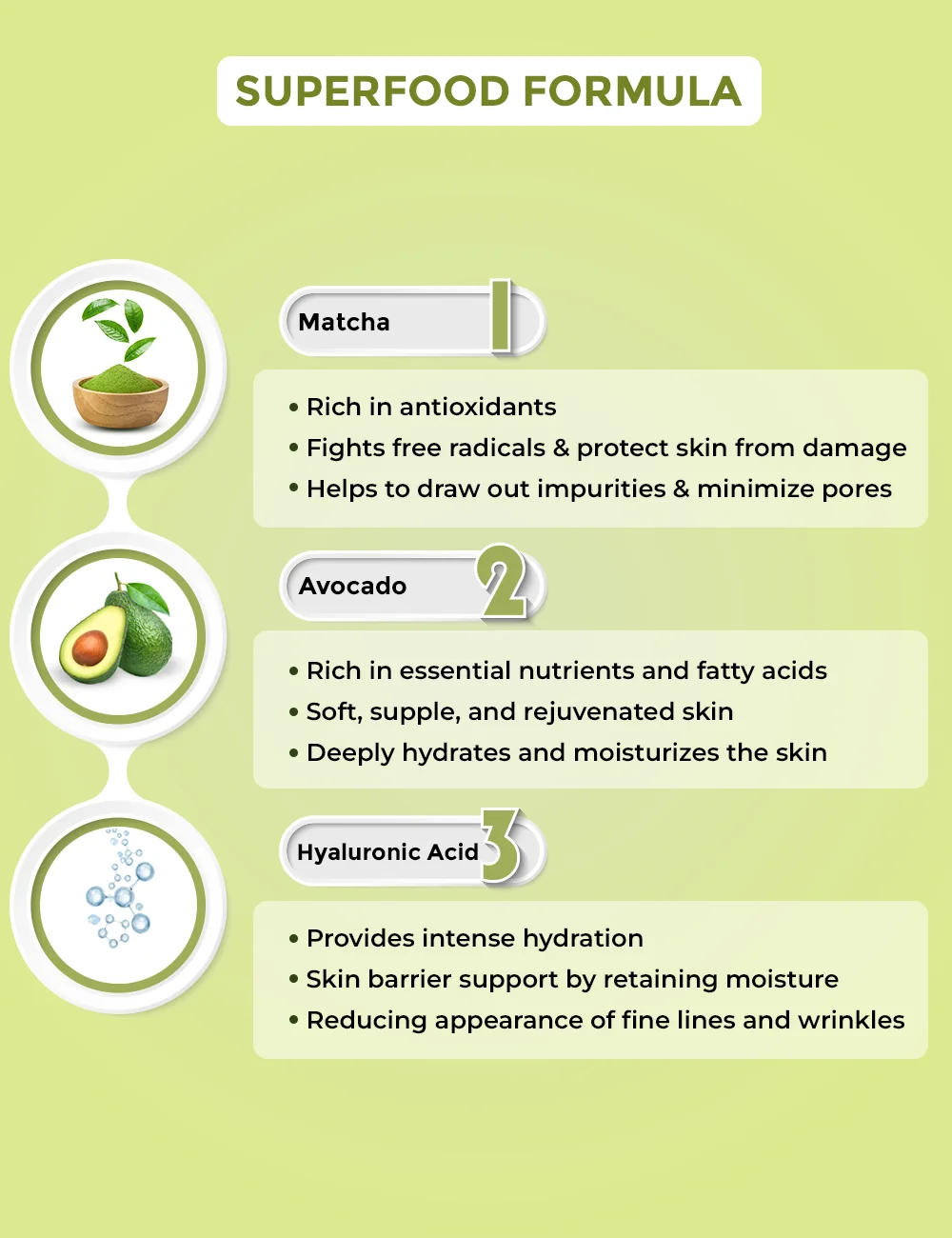Superfood Formula of Matcha, Avocado, and Hyaluronic Acid to deeply cleanse and nourish your skin for a fresh and radiant complexion
