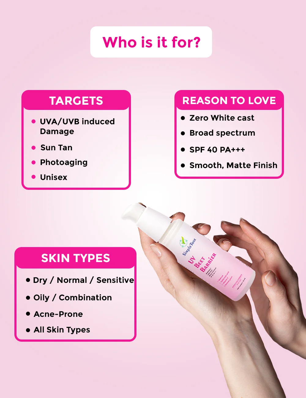 What It Does :  Shields from UVA + UVB rays. This sunscreen ensures your skin is safeguarded from the full spectrum of UV radiation, reducing the risk of sunburn, and premature aging.