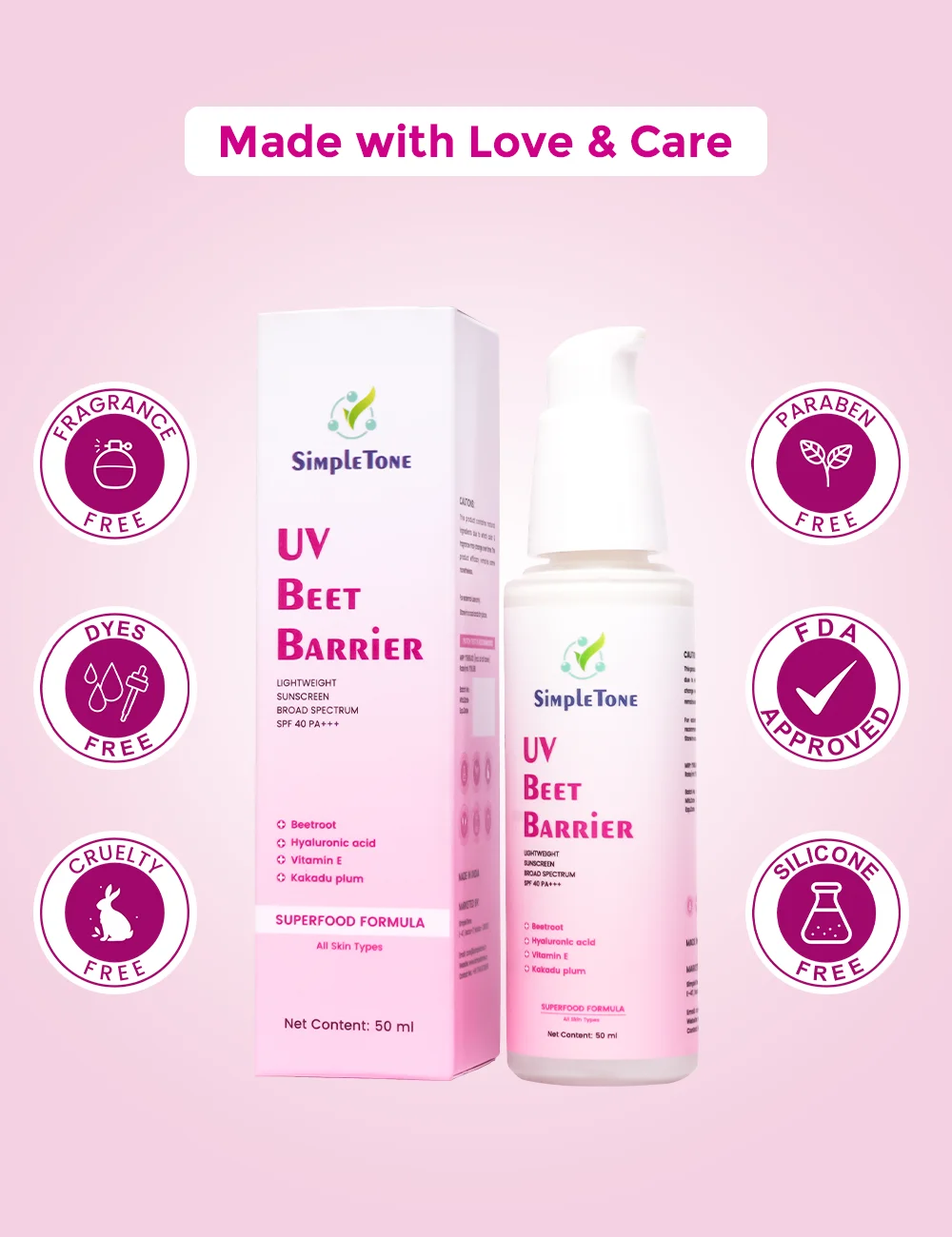 Meet the UV Beet Barrier Sunscreen, designed with a powerful superfood formula including Beetroot, Vitamin E, Kakadu Plum, and Hyaluronic Acid. This lightweight, broad-spectrum SPF 40 PA+++ sunscreen protects your skin from UVA and UVB rays without leaving a white cast. Beetroot and Vitamin E provide antioxidant protection against oxidative stress, while Kakadu Plum and Hyaluronic Acid deliver intense hydration. Perfect for all skin types, this velvety sunscreen ensures your skin remains protected, moisturized, and radiant.